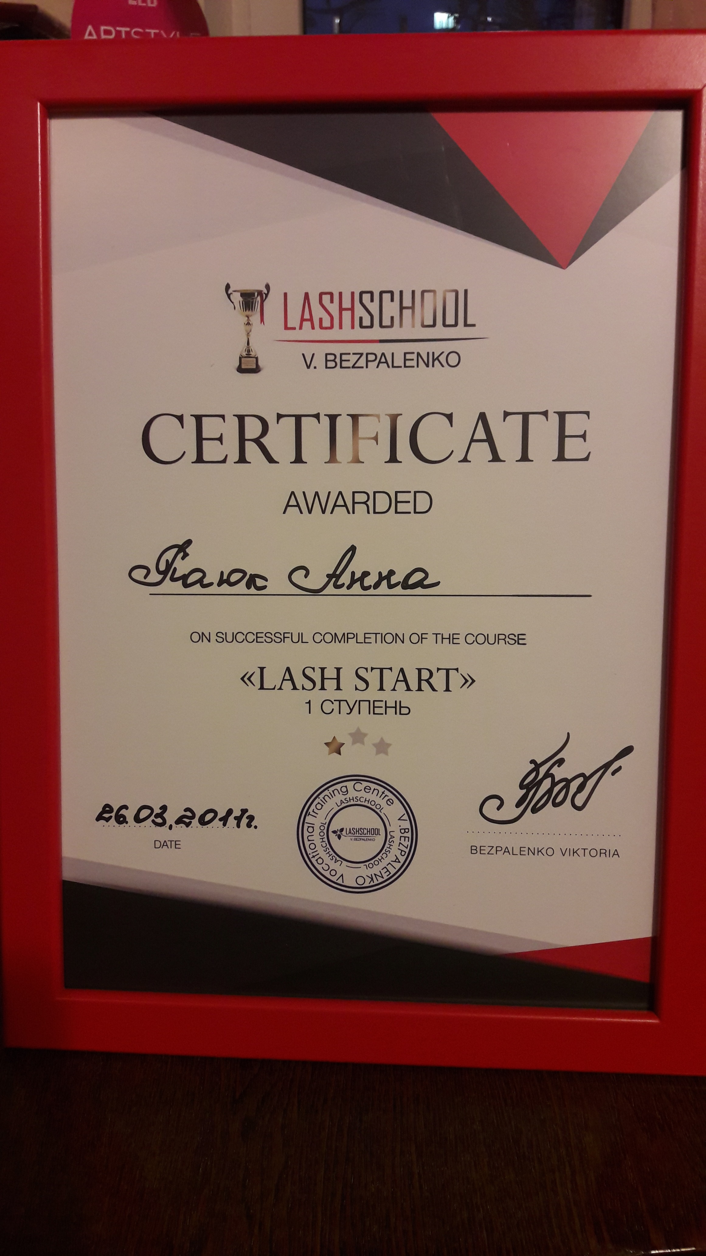 Окончила курсы в 2016/2017 году в школе студии V.Bezpalenko. Онлайн курсы Татяны Тележниковой и Елены Поль.